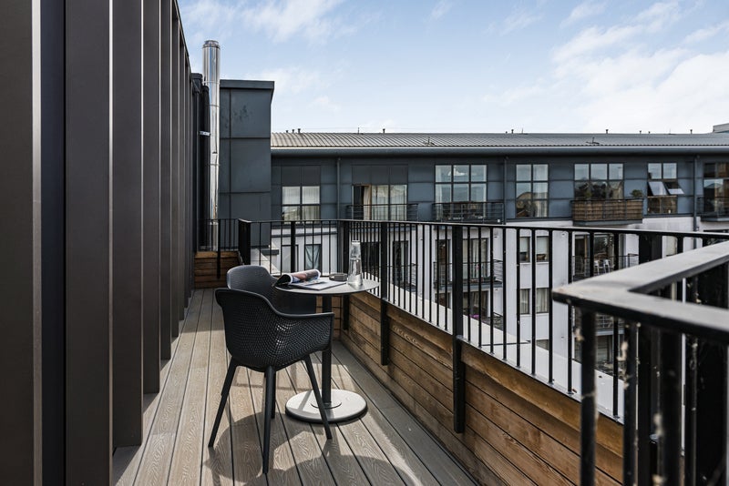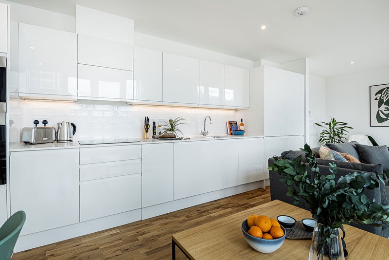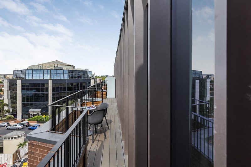 The penthouse apartment boasts a comfortable and stylish living space with modern furnishings. The open-planned living area is perfect for relaxing or entertaining guests, and the fully fitted kitchen includes integrated appliances for convenience. The bedroom is well-sized and furnished with a double bed and wardrobes, providing ample storage space. The high-spec bathroom features quality fittings, tiling throughout, and a bath with a rain shower. The spacious balcony offers a lovely outdoor space with multiple access points for residents to enjoy.