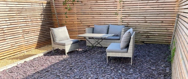 The house is spread over two floors, with a cozy living room and a well-equipped kitchen on the ground floor. The bedrooms are located on the first floor, offering ample storage space and comfortable furnishings. The bathroom features an electric shower and a bath tub for relaxation. The property is fully furnished, including new bedding and kitchen utensils, with a private patio garden for outdoor enjoyment. The atmosphere is welcoming and practical, with a focus on comfort and convenience for the residents.