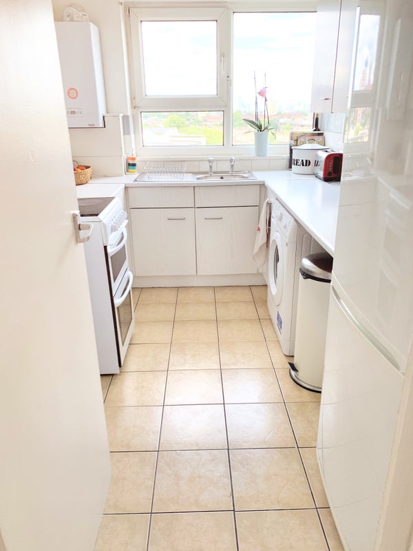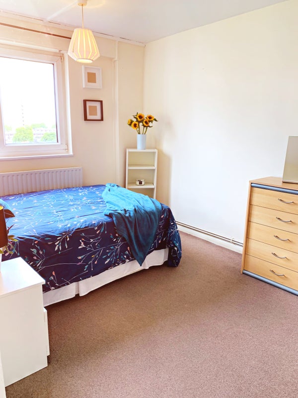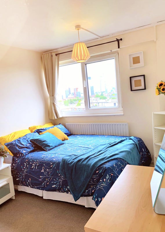 This spacious room is located in a newly decorated three-bedroom flat on the 9th floor, offering stunning views of London in a quiet neighborhood. The flat features a shared kitchen and bathroom, and is conveniently situated less than a 2-minute walk from Stockwell tube station. The rent includes all bills such as 200mb wifi, water, council tax, gas, and TV license. The flatmates are easy-going professionals who are kind, clean, and friendly, seeking a like-minded individual to share their home.
