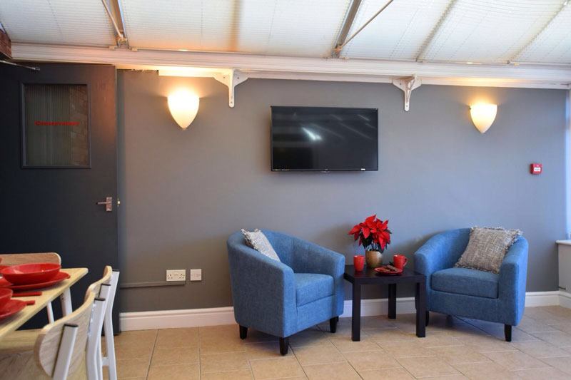 The property features 7 large double bedrooms and one standard double room, each equipped with brand new furnishings for ultimate comfort. Bedrooms come with orthopedic mattresses, ample storage space, desks, chairs, and stylish decor. The ground floor social space includes a well-equipped kitchen with a coffee machine, large fridge freezers, and a washing machine. Multiple seating areas and a wall-mounted LED TV create a cozy atmosphere for residents to relax and socialize.