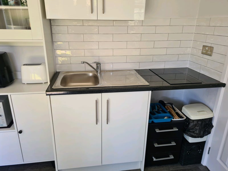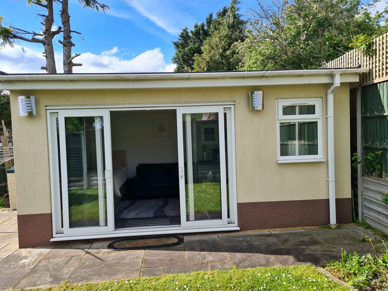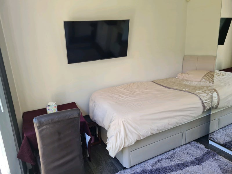 The en-suite Double Room Studio exudes comfort and practicality, with ample storage space including under bed storage and a new mirrored wardrobe. The room is well-equipped with modern amenities such as a 40' LED TV and complimentary Wifi. The newly fitted kitchenette adds convenience for residents, allowing for easy meal preparation. The shared garden, accessible through large patio doors, offers a tranquil outdoor retreat. The atmosphere of the flat is peaceful and family-oriented, making it an ideal living space for a single occupant.