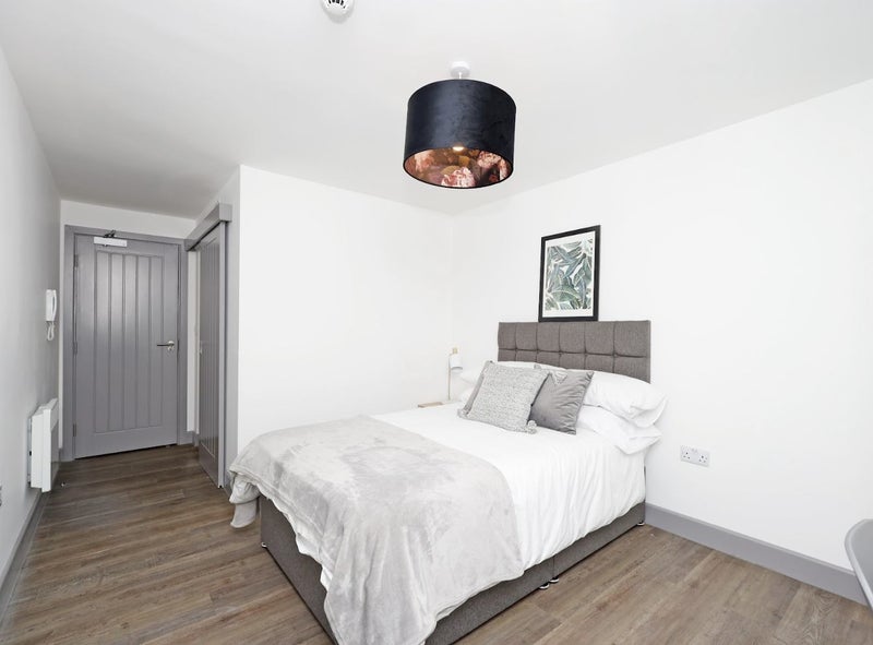 Your bedroom is furnished with contemporary pieces including a double bed, side table, wardrobe, desk, and chair for a comfortable night's sleep. The stylish shower room features a large shower, wash basin, toilet, and heated towel rail. The shared modern kitchen is equipped with a cooker, hob, integrated fridge freezer, and washer for your convenience.