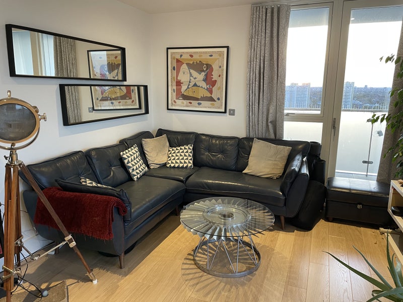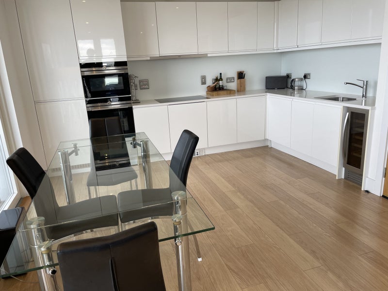 The bright double bedroom features blackout curtains, a wardrobe, and a chest of drawers. The room opens to a large west-facing terrace that receives ample sunlight in the afternoons. The private bathroom includes a bath, shower, sink, and plenty of shelf space. The flat comes fully furnished with an open-plan kitchen equipped with cooking essentials, a large fridge freezer, and a dining table that can seat up to six. The living room has a big comfy sofa, a large flatscreen TV connected to a Sonos sound system, and floor-to-ceiling windows that provide natural light all day.