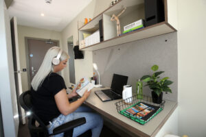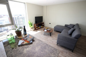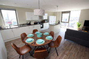 Our Bronze En-Suite offers spacious student living with a private room, double bed, study desk, and floor-to-ceiling windows with blackout blinds. Share a fully equipped kitchen with a dishwasher, and unwind in a lounge with dining space, sofas, and a widescreen TV. All bills and TV license included for a stress-free experience.