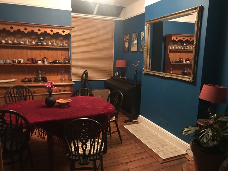 The single room available is well-furnished and designed for comfort. The shared living and dining areas are spacious and inviting, perfect for relaxing or entertaining guests. The overall atmosphere of the flat is peaceful and clean, ideal for those who appreciate a tidy living space. The kitchen is fully equipped for cooking and meal preparation, and the outside patio offers a nice spot for outdoor relaxation.