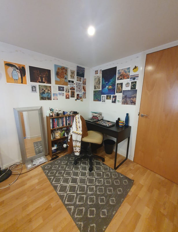 The en-suite double room offers a comfortable and practical living space, complete with a desk and other essential furniture. The bedroom receives ample sunlight, as does the inviting living room. The flat exudes a cozy atmosphere, with a focus on sharing the space harmoniously. The current resident values a quiet environment and enjoys occasional social interactions like movie nights or cooking together. While the flat is not a party hub, there are opportunities for friendly gatherings and shared activities.