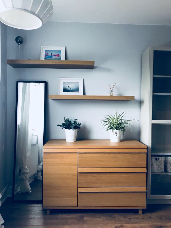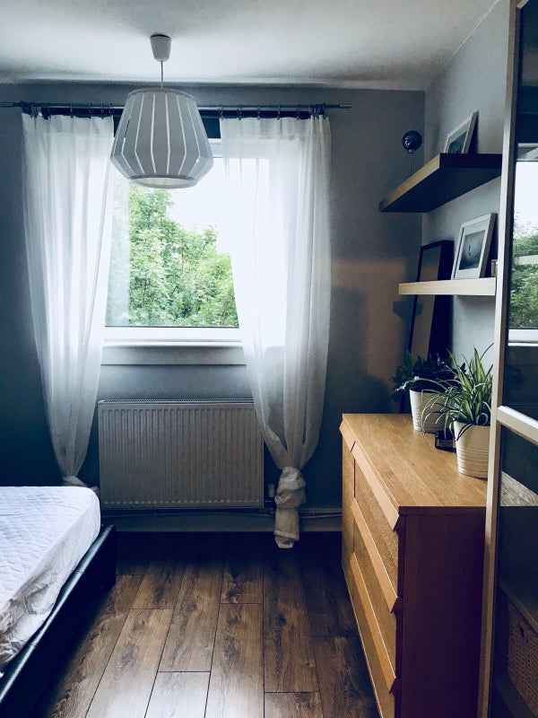 The available bedroom is bright and spacious, furnished with a double bed, mirrors, drawers, bookshelves, cabinet, and a hanging rail for clothes. The flat features double glazed windows, central heating, and a small utility room for bikes. Shared spaces include a kitchen, living/dining room, bathroom, and a shared balcony, creating a cozy and welcoming atmosphere for residents.