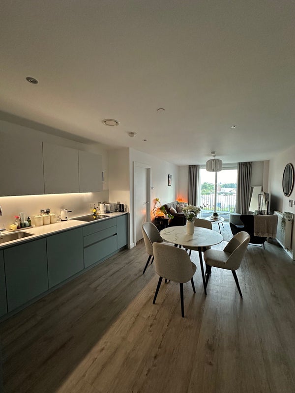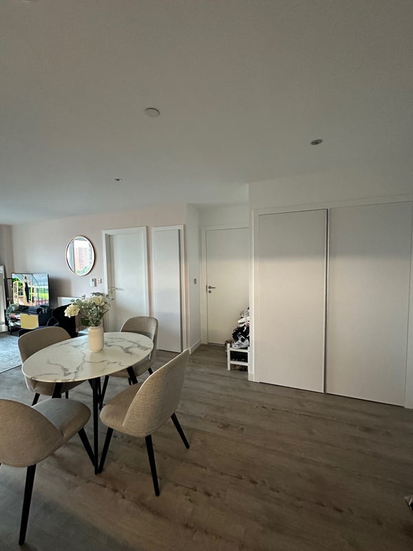 This modern flat in Middlewood Locks offers a King Size Double En-Suite room for rent, with the current tenant looking for someone to take over the tenancy. The flatmate, Molly, is described as lovely, and the flat is fully furnished with various appliances already in place. The room boasts ample storage space and a designated area for a desk. The monthly rent is £922.00, inclusive of all bills, with no deposit required. The property is conveniently located within walking distance of Spinningfields, Deansgate, and the town center. Nearby amenities include Regent Retail Park, a Coop, Seven Brothers Pub, and a cafe. The building is gated for added security, with a fob required for entry.