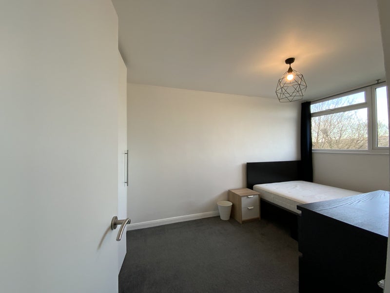 The available room is thoughtfully furnished with a double bed, under bed drawer, bedside drawers, chest of drawers, bookcase, mirror, blackout curtains, and a built-in wardrobe (1.15m x 0.8m). The overall feel of the space is cozy and practical, ensuring comfort for the residents. The flat also boasts shared spaces that are well-maintained and provide a welcoming atmosphere for all occupants to enjoy.