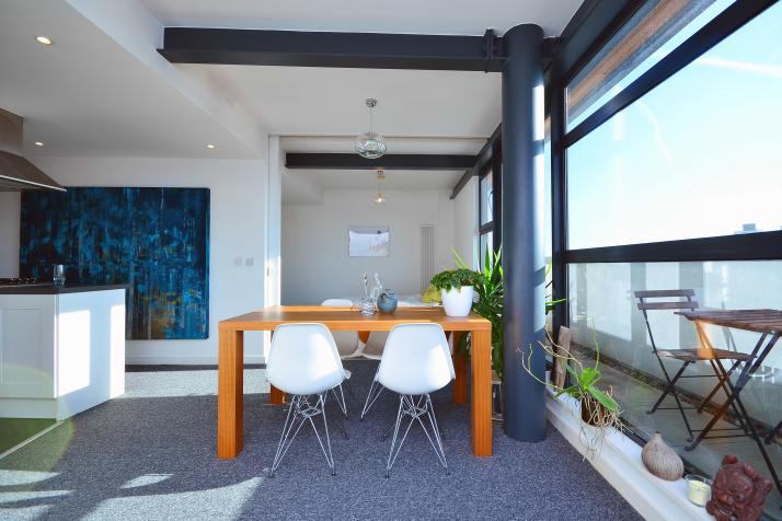 The available room is fully furnished and comfortable, with a focus on practicality and style. The apartment features floor-to-ceiling windows offering spectacular views of Canary Wharf, a large private balcony for secure bicycle storage, a cozy lounge with an Italian designer sofa, and a 55" LED smart TV. The spacious dining area includes a glass dining table and stylish chairs, creating a welcoming atmosphere for residents to relax and entertain.