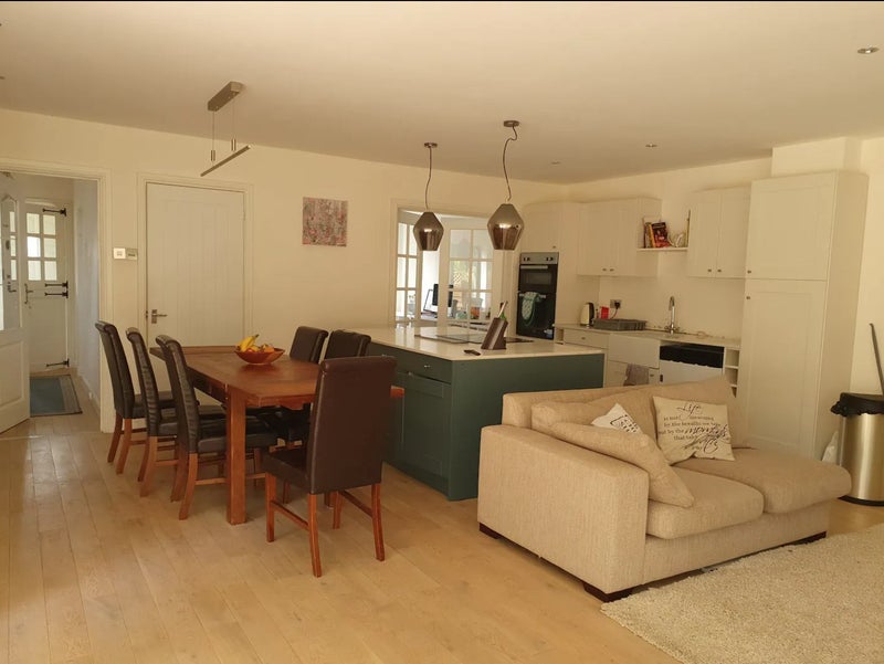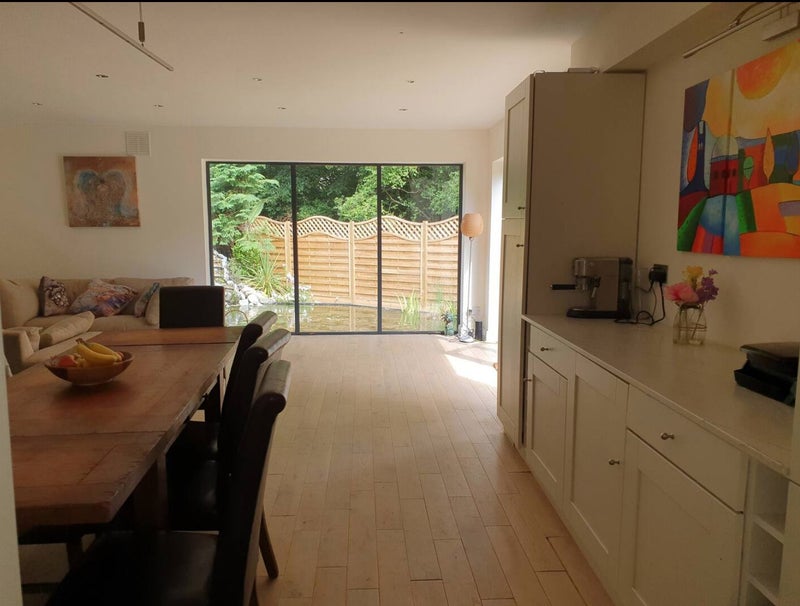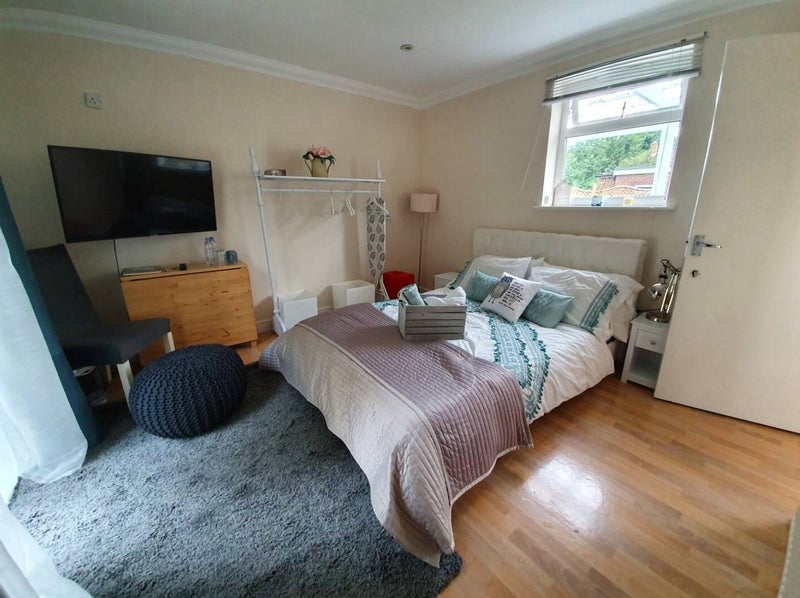 Located in a peaceful neighborhood, this property offers a spacious room with a double bed, wardrobe, foldable table/desk, and a comfortable leather chair. The en-suite bathroom includes a shower and a washing machine for convenience. The house is an end-of-terrace property with a large garden that provides direct access to the woods. High-speed 6G Wifi and subscriptions to TV services like BBC iPlayer, Netflix, and Amazon video are included. The flatmates include a single mother with a 14-year-old daughter and an 11-year-old son, along with a friendly cat. The host is a professional who enjoys spending time with her kids, cooking, jogging, tennis, reading, and gardening.