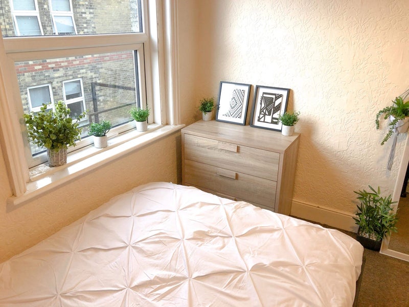 The first bedroom is extra large and comes fully furnished with a double ottoman storage bed, bedside table, chest of drawers, and wardrobe. The second bedroom is a small double room also furnished with a double ottoman storage bed, bedside table, chest of drawers, and wardrobe. The shared spaces in the house are designed for comfort and practicality, ensuring residents have a cozy and functional living environment. The atmosphere of the flat is relaxed and inviting, making it a great place to unwind after a long day.