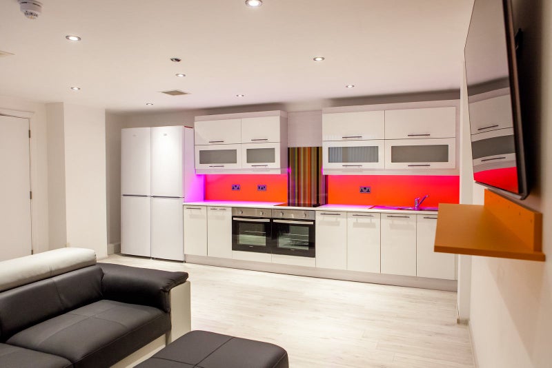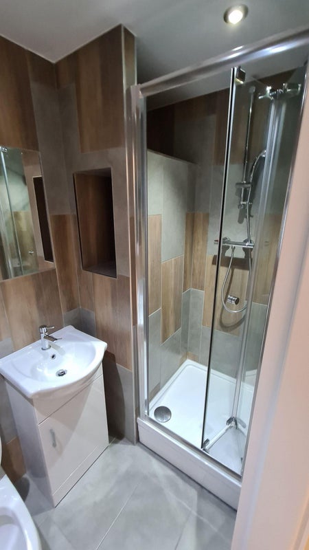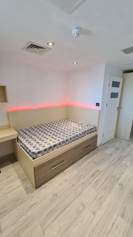 The ensuite room is spacious and well-equipped, providing a comfortable living space for the occupant. Furnished with essential amenities, the room offers a cozy atmosphere for studying and relaxation. The shared kitchen and living room are modern and functional, creating a welcoming environment for socializing with flatmates. The overall feel of the flat is homely and inviting, with a focus on comfort and practicality for the residents. The communal areas are well-maintained and offer a pleasant atmosphere for residents to enjoy.