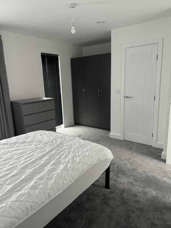 This spacious en-suite master bedroom is located on the top floor of a house, offering a comfortable living space for residents. The room comes fully furnished with a wardrobe, chest of drawers, and a bedside table. Additionally, the top floor features a large balcony for relaxation and enjoying the outdoors. The hall and kitchen are shared with the landlord, an IT professional who works from home three days a week and in the office two days a week. The house is conveniently located near Langworthy tram stop, bus stops, 24-hour Tesco Extra, Lidl, Aldi, and Salford shopping center, all within a 10-15 minute walking distance. Plenty of takeaways and shops are also nearby, making it a convenient location for daily needs.