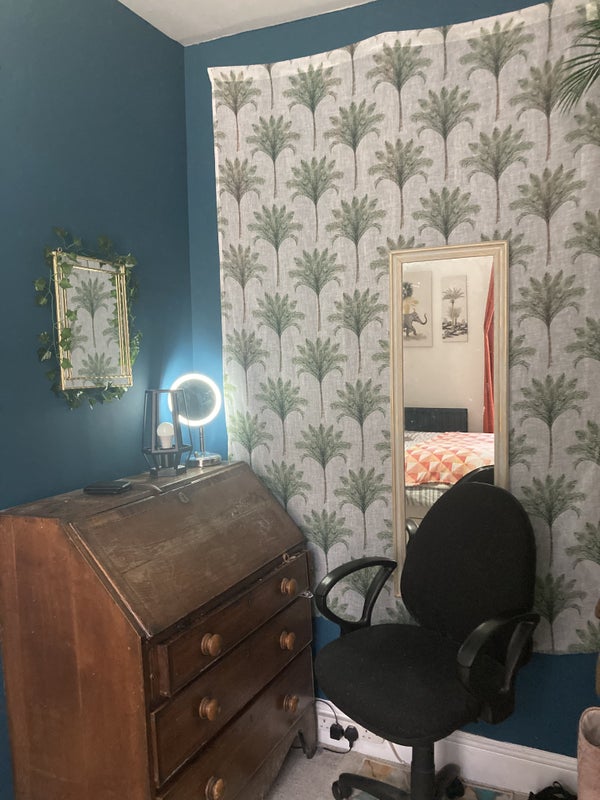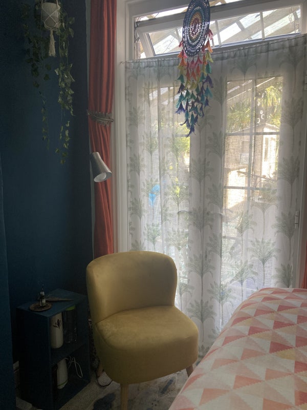 The available room is thoughtfully furnished for comfort and practicality, featuring a new mattress protector, chest of drawers, bedside table, and a desk with an office chair. Additionally, there is a small 'relaxing chair' and a tall light for added convenience. The atmosphere of the flat is welcoming and conducive to a peaceful living experience. The shared bathroom is well-maintained, and the fully furnished kitchen provides all the necessary amenities for daily living.