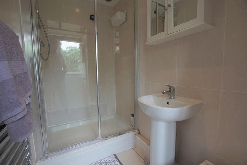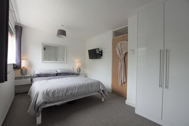 The available room includes a double bed, desk, 2 large integrated wardrobes, bedside cabinets, curtains, and blinds for blackout. The en-suite bathroom features a shower, sink, and cabinet. The shared lounge area is cozy with a corner sofa, TV, and dining table. The garden offers a patio, bike storage, and a grassy area for relaxation. There are two bathrooms in the property, one downstairs with a stylish shower and toilet, and one upstairs with a shower, toilet, and bath, providing ample storage space for towels and toiletries. The landlord, a friendly working professional, lives locally and promptly addresses any maintenance issues.