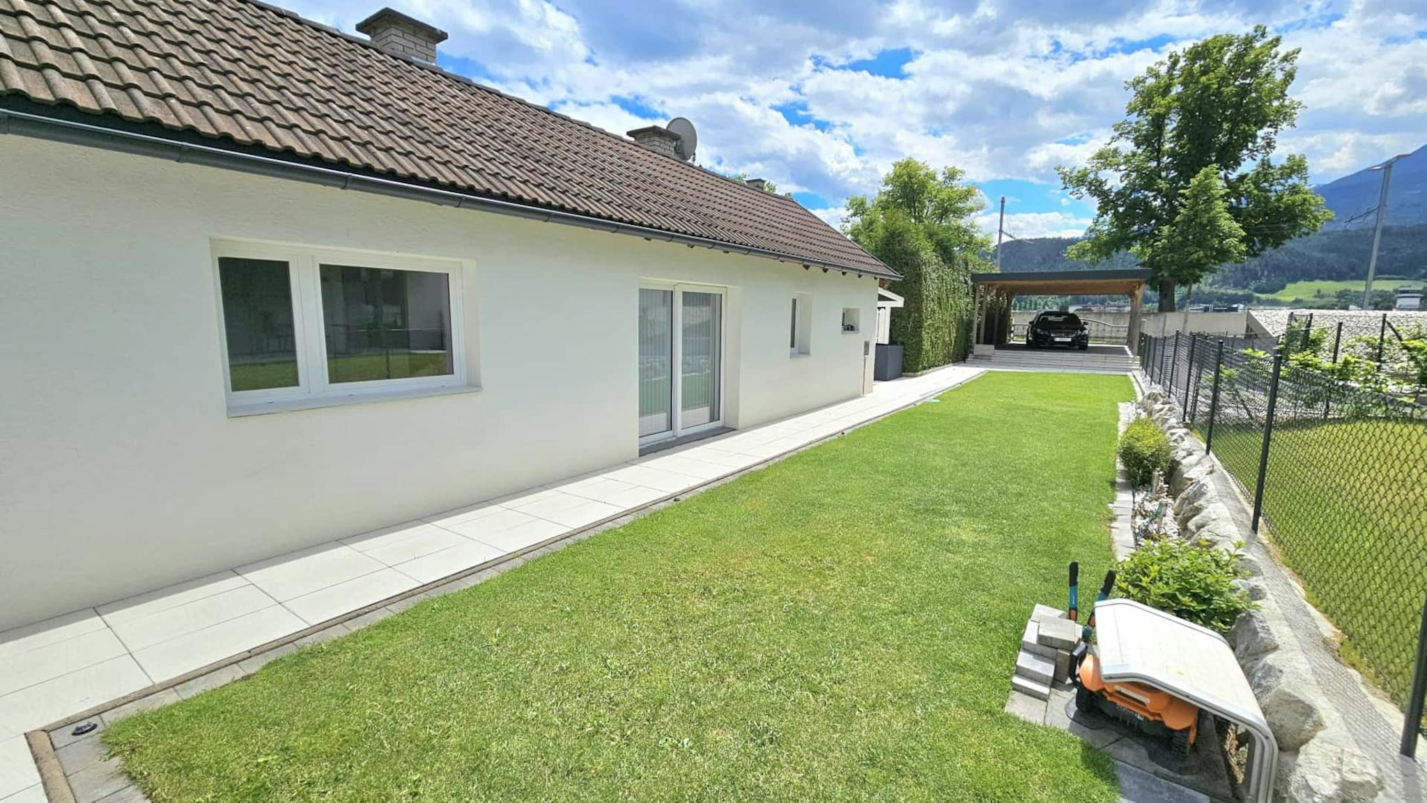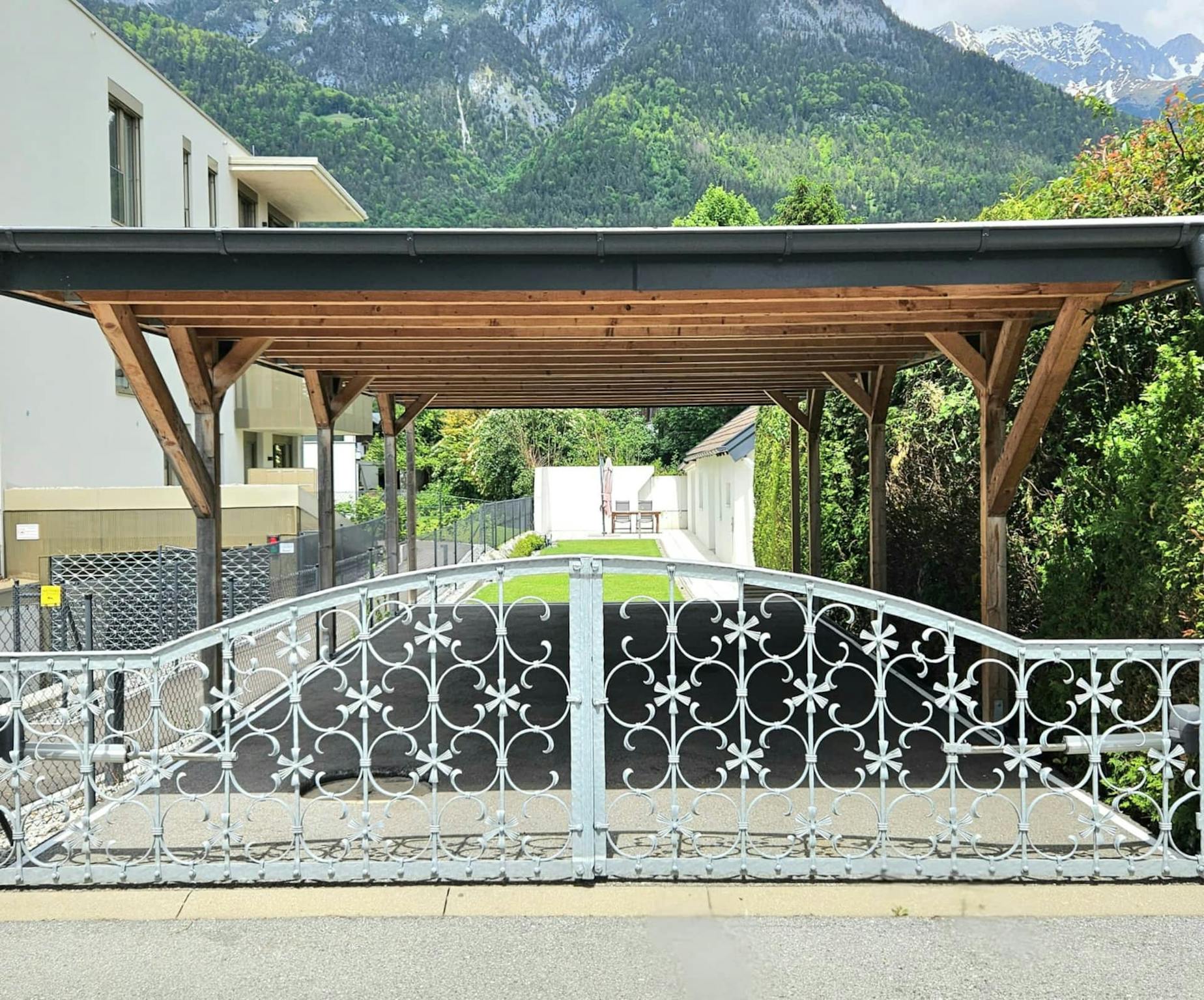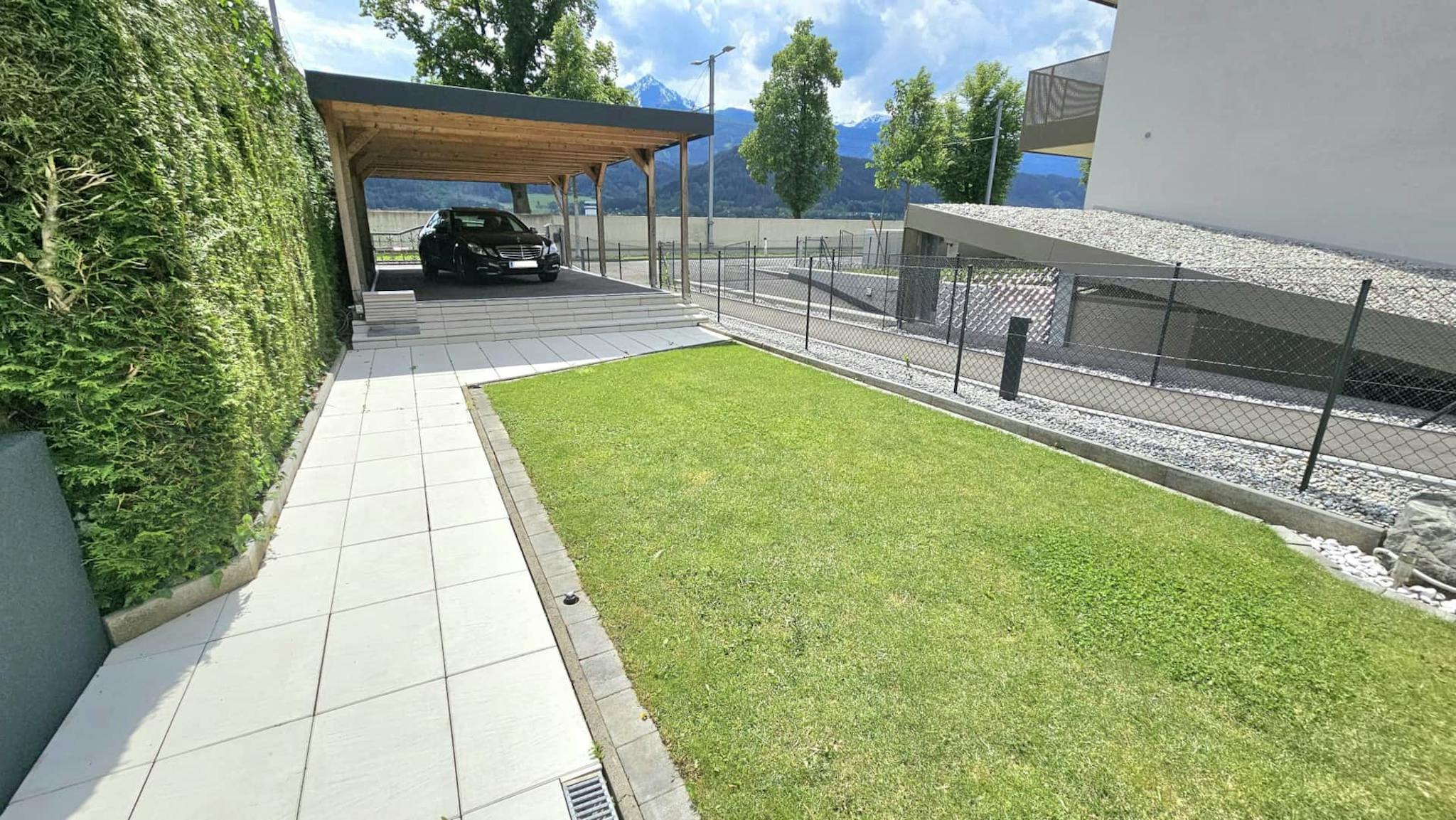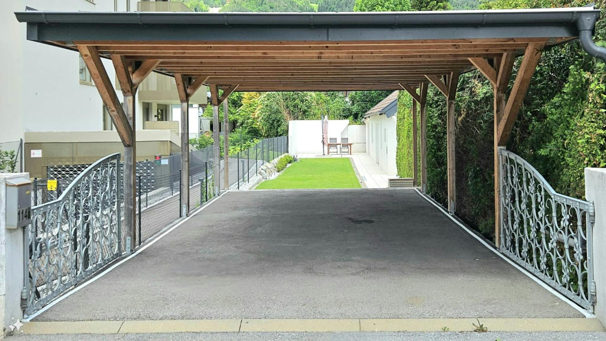 Ein überdachter Privatparkplatz befindet sich direkt auf dem umzäunten Grundstück.