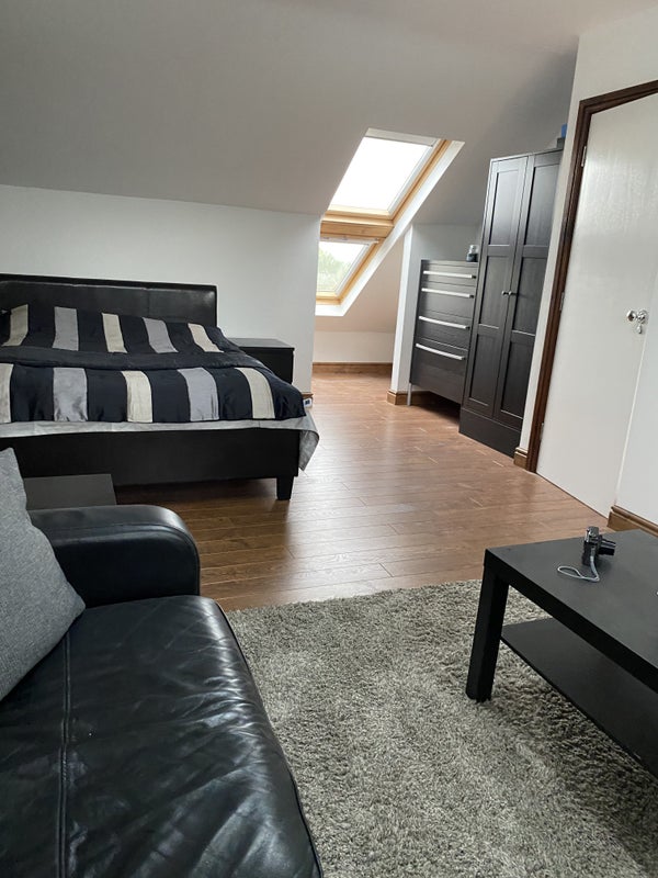 The very large attic bedroom with a combined living area and en-suite offers ample space and privacy for the resident. The room is well-furnished and designed for comfort, making it a cozy retreat after a long day. The shared spaces in the house are inviting and well-maintained, creating a warm and welcoming atmosphere for all residents. Practicality and comfort are key features of this living space, ensuring a pleasant living experience for the occupants.