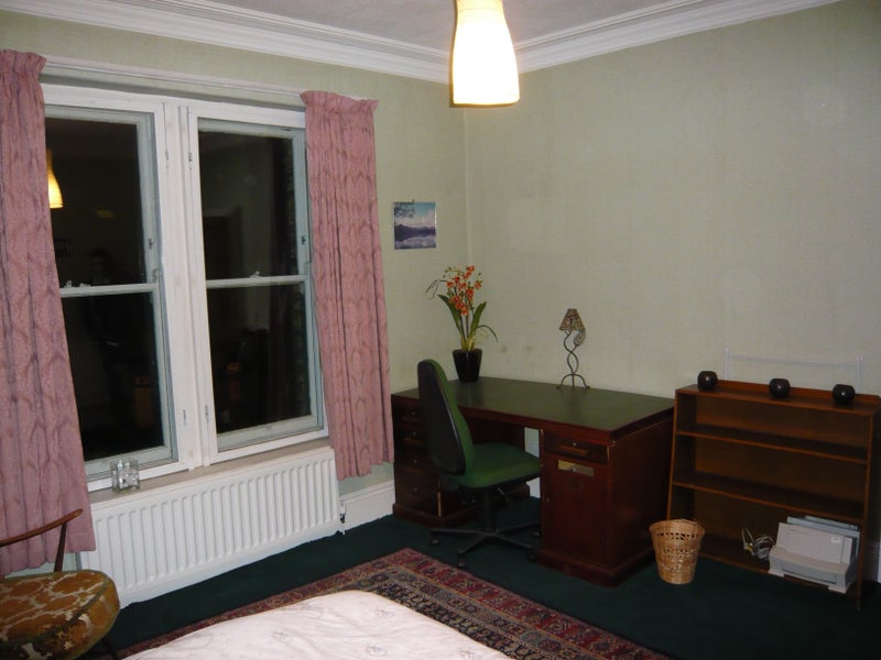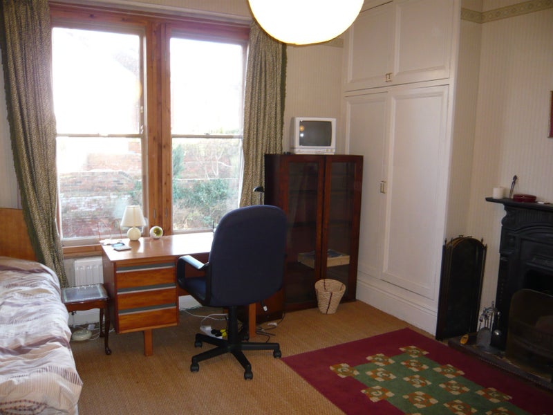 The available room is a generous 3.6 x 3m (14'x12') with a wardrobe, single bed, chest of drawers, large desk and chair, easy chair, and bookshelves. The overall atmosphere of the house is friendly, quiet, and sustainable, with a focus on comfortable and practical living spaces. The shared areas include two living rooms, a large kitchen, and two bathrooms, providing ample space for residents to relax and socialize.