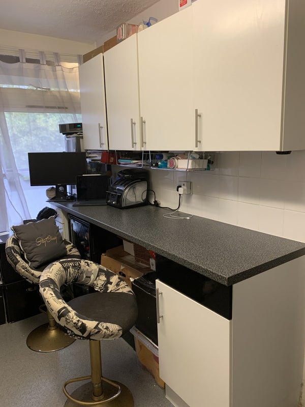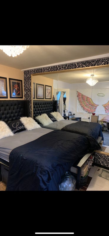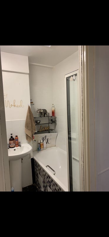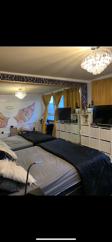 This flat, located on the top floor of a split-level apartment, features a large kitchen with double oven, American fridge, microwave, breakfast bar, and ample cupboard space. The bedrooms and bathroom are on the top level, while the kitchen, living room, and balcony are on the lower level. The available room comes with a king-size bed and shared access to the kitchen, bathroom, and living area. Rent includes water, gas, electricity, council tax, TV license, and internet, with Freeview TV available in the bedroom.