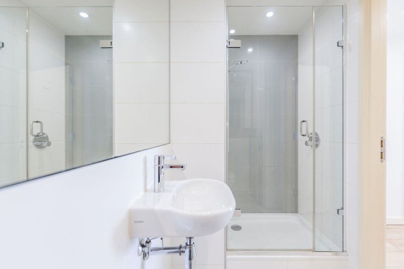 The penthouse apartment features a spacious entrance hall leading to a dining area and a large open-plan reception room and kitchen. Both bedrooms are generously sized doubles with views similar to the reception room. The apartment includes one en suite shower room and a second guest bathroom. The communal areas have a modern minimalist design, and residents have access to express lift service and one allocated secure car parking space. The overall atmosphere of the flat is one of sophistication and comfort, perfect for those seeking a high-end living experience in the heart of London.