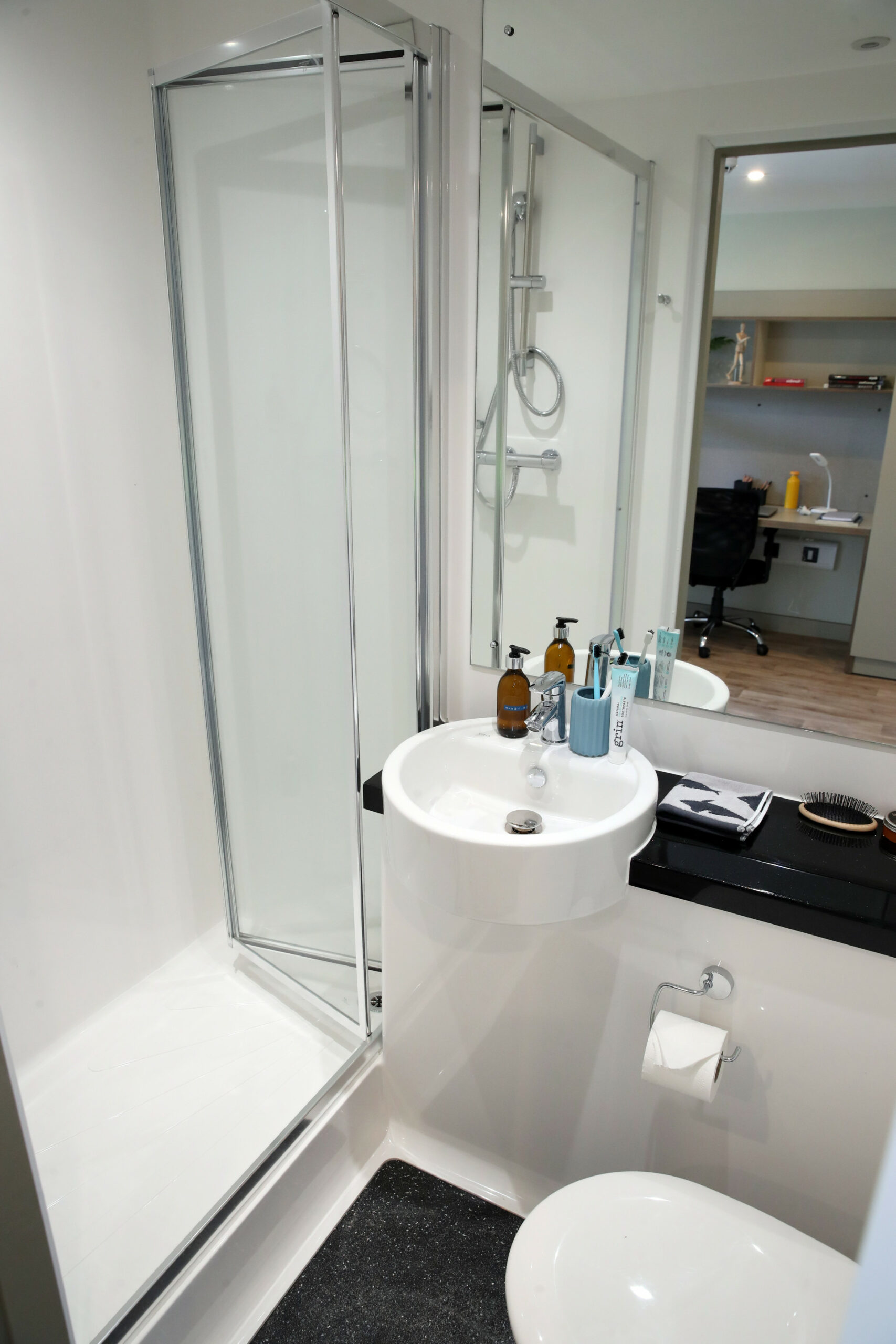 Soak up sky-high views from our Platinum Studio, offering elevated student living at its finest. This premium space features a double bed with storage, study desk, spacious wardrobe, and a sleek kitchenette with dining area. Enjoy floor-to-ceiling windows, blackout curtains, and a modern en-suite bathroom with a large shower and extra-large mirror. With all bills included, it’s luxury and comfort