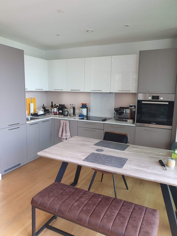 The available double bedroom is tastefully furnished and designed for comfort. The room features a Juliette balcony offering natural light and views of the city. The floor-to-ceiling wardrobe provides ample storage space for residents. The underfloor heating ensures a cozy atmosphere throughout the flat. The shared spaces, including the kitchen, are well-equipped and modern. The overall atmosphere of the flat is welcoming and conducive to relaxation after a long day.