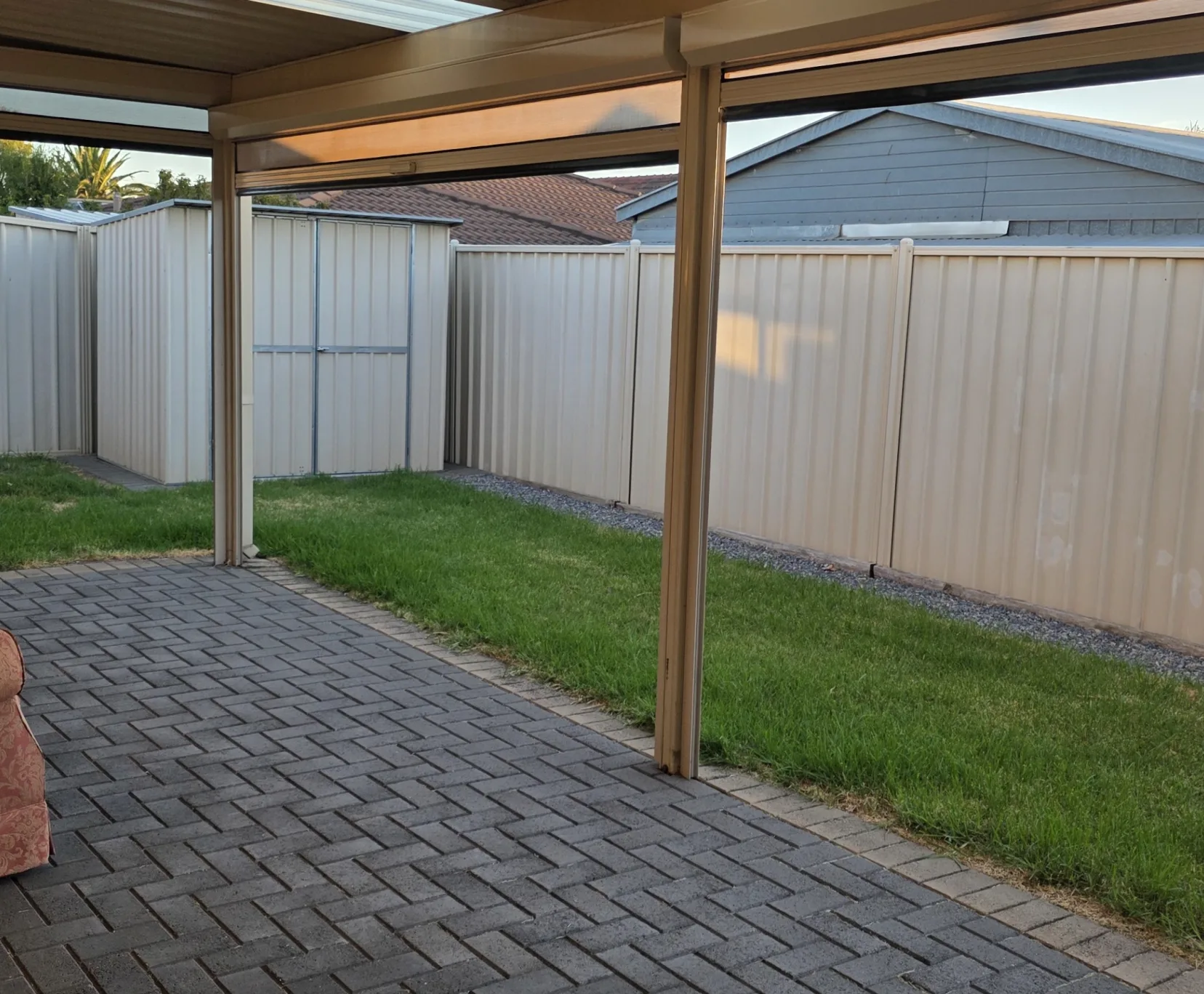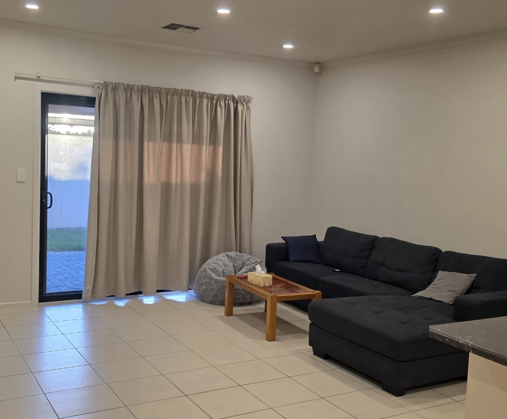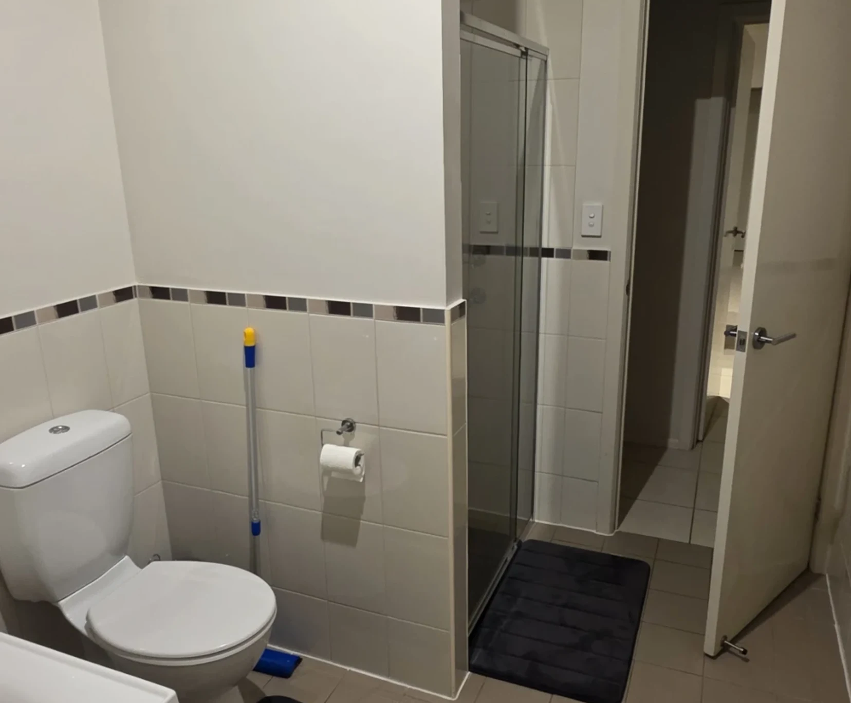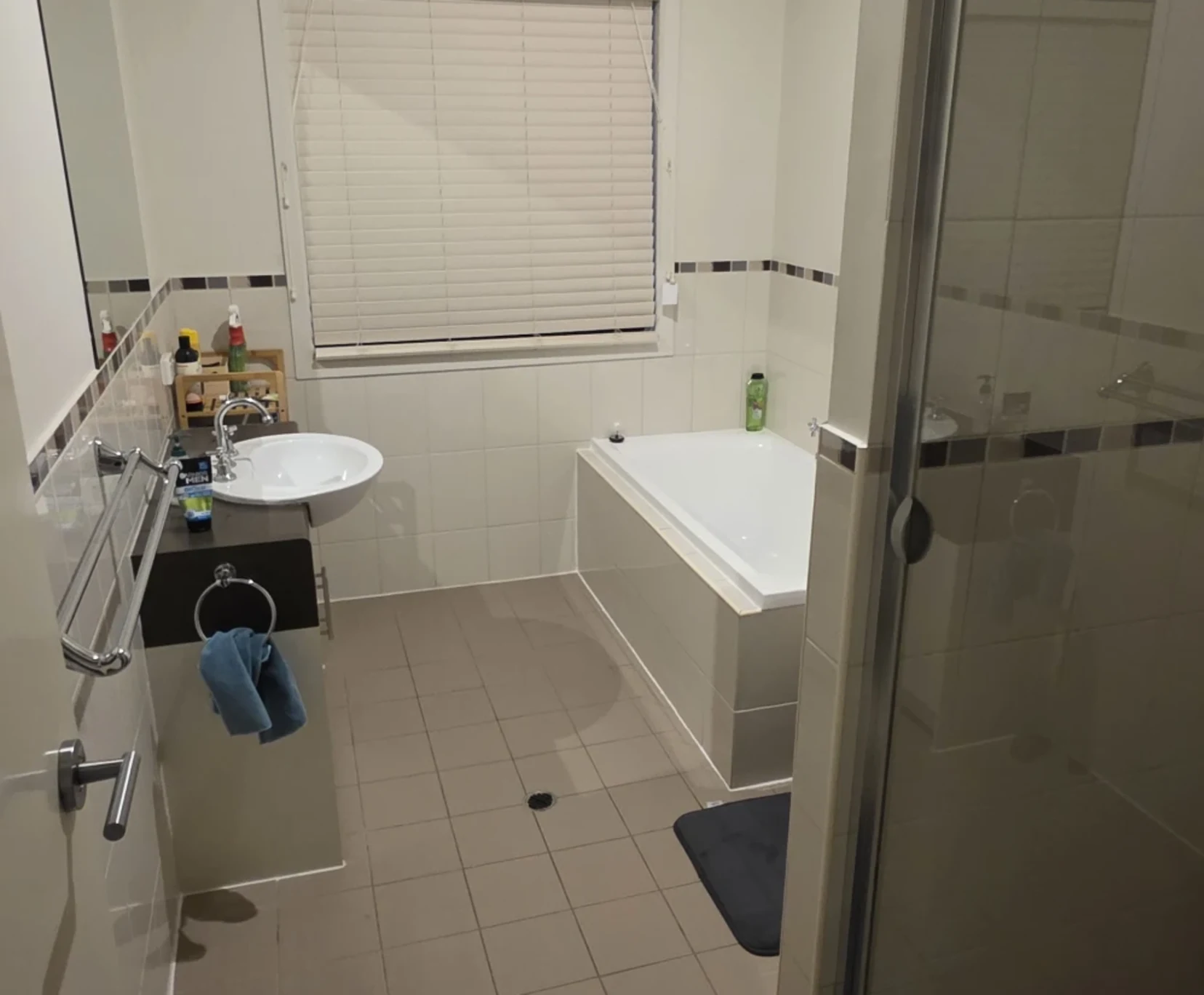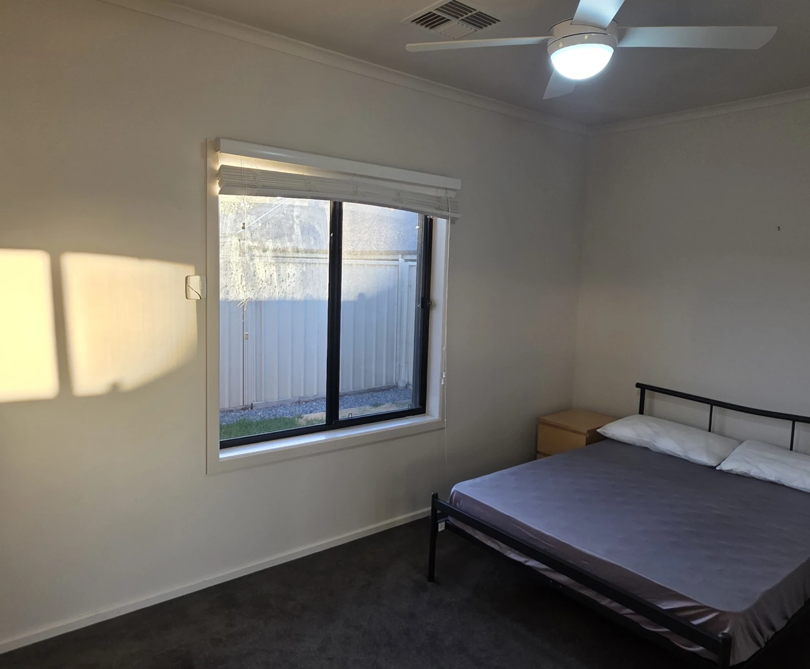 Your bedroom has a central vent for aircon and an automatic shutter for the window. The bedroom is 2.8m x 4m. There is a common bathroom which will be shared by you and one other. Other shared spaces include the laundry room, the living room and the back yard. The room currently has a queen bed, bed side tables and a sliding robe.