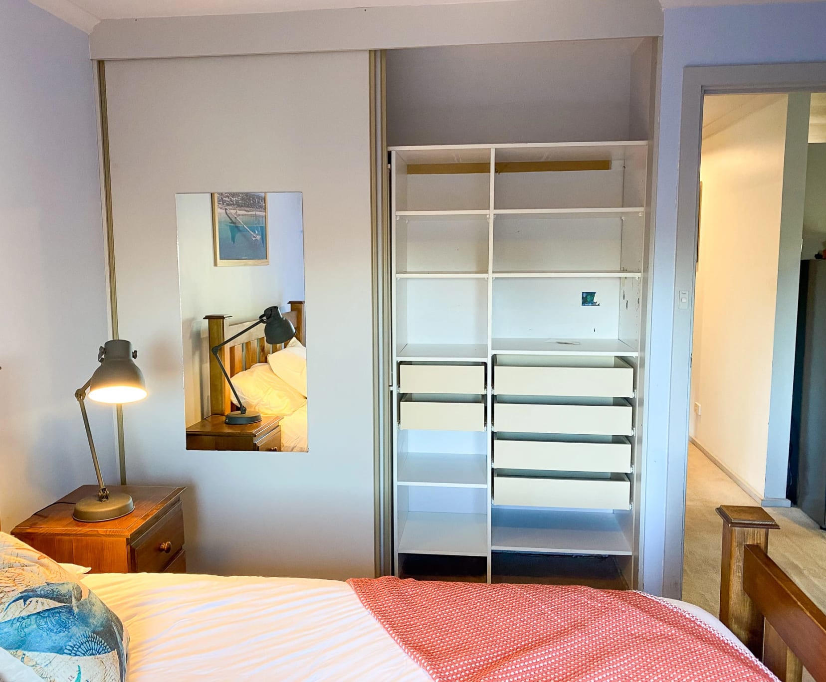 - Queen bed, bedside table and lamp