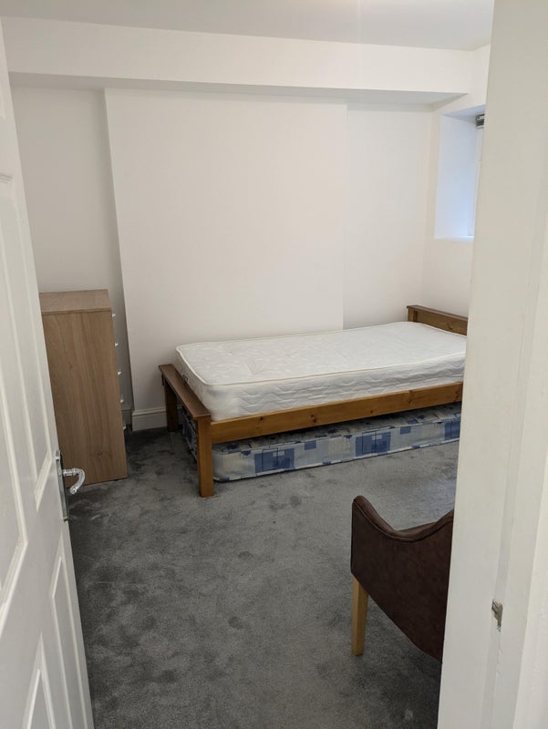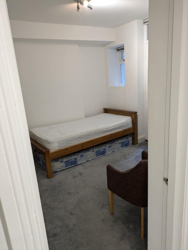 This two-bedroom basement flat offers a cozy living space with an open plan kitchen, living room, and dining room. The available room comes with access to a small courtyard, providing a touch of outdoor space. The bedroom is currently furnished with a single bed, but there is an option to switch to a double bed, albeit with a slight reduction in room size. The flat is seeking a flatmate to occupy the second room, making it an ideal opportunity for someone looking for shared accommodation.