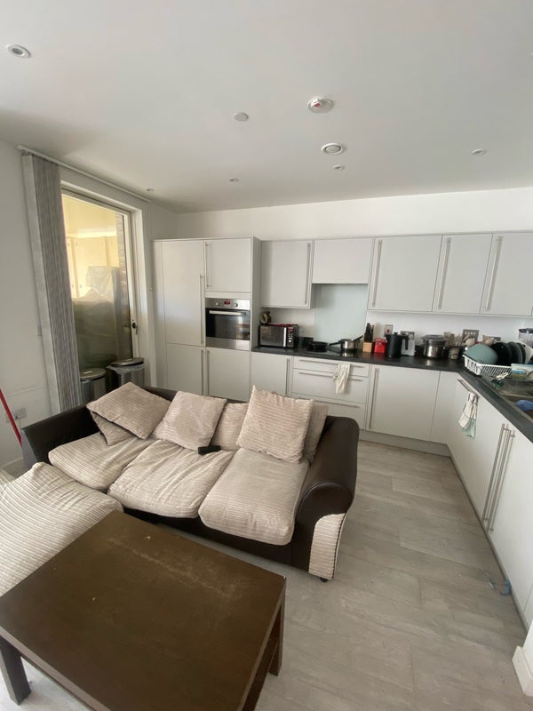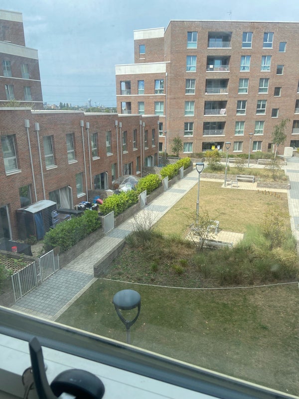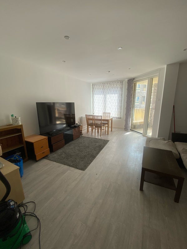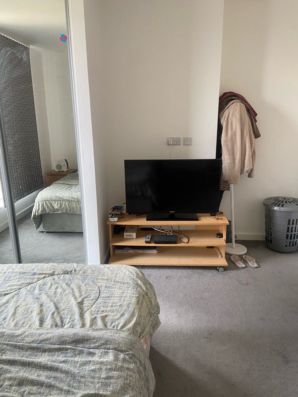 Located in Barking Riverside, this sublet double bedroom is available for short-term rental for 5 months. The rent includes all bills, access to a gym, and Virgin Media connections. The room is spacious and comes with 2 single beds for added privacy. The flat is a 2-bed setup with the other room occupied by a couple. Shared amenities include a bathroom, ample storage, dining table, and a large TV in the living area.