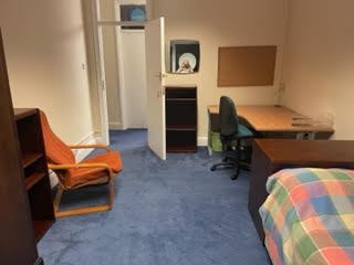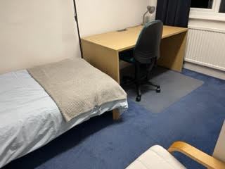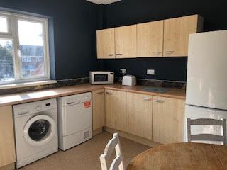 The flat features a large kitchen/dining room and two bathrooms, one with a shower cubicle and the other with a bath with a shower. The kitchen is well-equipped with cooking and eating utensils, ample cupboard space, and shared dining facilities. It includes essential appliances such as an electric oven/hob, washing machine, tumbledrier, fridge freezers, microwave, toaster, and kettle. Each bedroom is furnished with mirrors, lamps, bedside lights, desk lights, and comes with a complete set of bed linen. The rooms are carpeted, have radiators, windows with blinds and blackout curtains, ensuring comfort and convenience for residents.