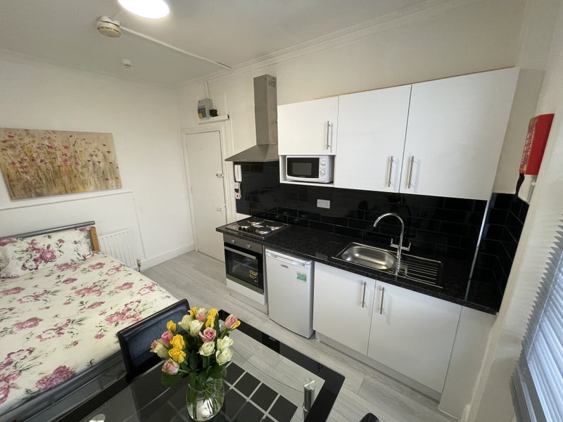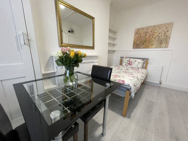The available room is a well-appointed single bedsit with comfortable furnishings and a cozy atmosphere. The private kitchen is equipped with a cooker, oven, and fridge, offering residents the convenience of preparing their meals. The wooden flooring adds a touch of warmth to the space, while the garden-facing view provides a tranquil setting. Shared spaces like the communal bathroom and garden are well-maintained, creating a welcoming environment for residents to relax and socialize. The presence of a caretaker and 24-hour CCTV security ensures the safety and security of all occupants.