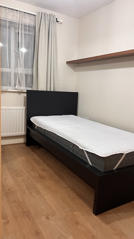 The available single room is thoughtfully furnished to provide comfort and functionality for the resident. The room includes essential furniture such as a bed, wardrobe, and drawers, ensuring ample storage space. The shared spaces in the flat, including the bathroom and kitchen, are well-maintained and fully equipped for the convenience of the flatmates. The overall atmosphere of the flat is cozy and welcoming, creating a pleasant living environment for the residents.