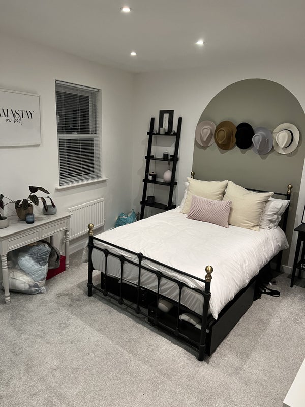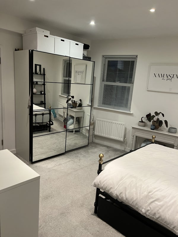 The available bedroom in this flat is fully furnished with all the essentials for a comfortable living experience. The room features a cozy double bed with under-bed storage, two double wardrobes for ample storage space, a desk for work or study, an office chair for comfort, and shelves for organizing personal items. The overall feel of the space is inviting and practical, designed for both relaxation and productivity. The shared spaces in the flat are well-maintained and offer a comfortable atmosphere for residents to unwind and socialize. With a bi-weekly cleaner, the flat is kept tidy and welcoming for all occupants.
