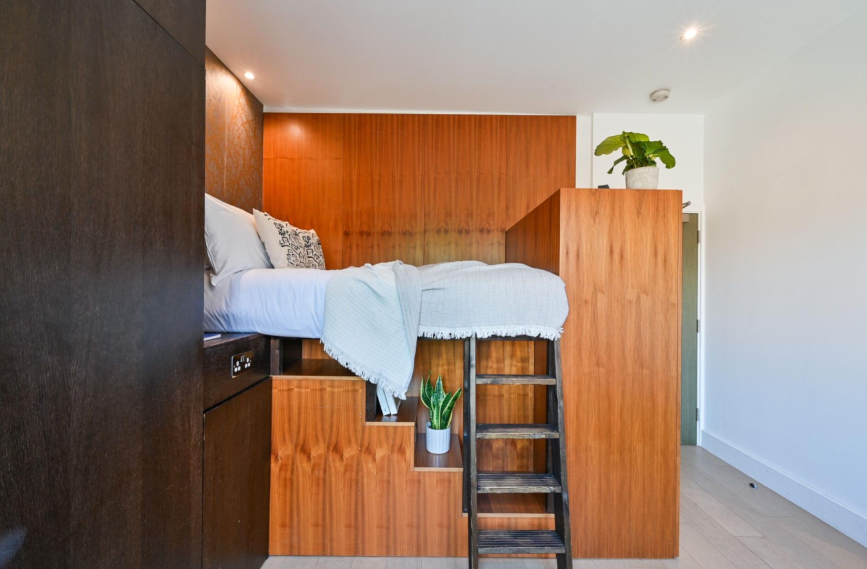 An open-plan, roomy studio apartment, fully furnished with a comfy double bed and plenty of storage space underneath. In the kitchenette (that can also be closed off when not in use), you will find 2 x induction hobs, a sink, a microwave and an under-the-counter fridge with freezer box. You'll also find additional storage either next to, or at the end of the bed. There's also a small dining/work table and a comfy armchair - the perfect spot for your morning coffee. The en-suite is modern and bright with a walk-in shower and white and metallic finishes throughout.